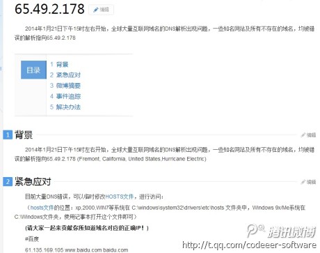最新消息在2014年1月21日下午3點30分,中國大陸境內網站域名DNS服務器被攻擊,域名解析被強制解析跳轉到IP:65.49.2.17,所在的美國服務器,給中國網站帶來巨大影響。